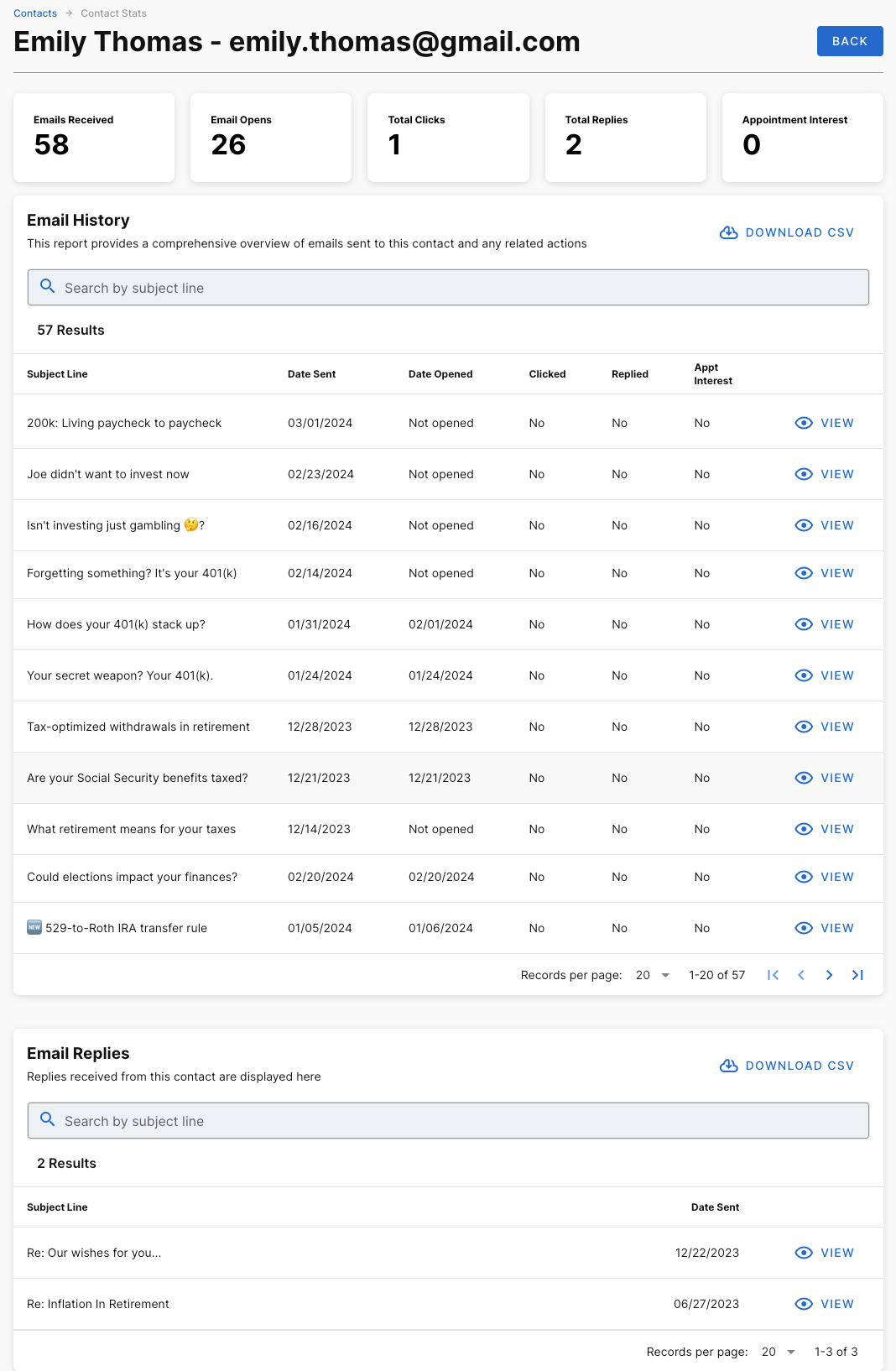- View Option: Click "View" to see exactly what the email looked like when sent to this contact