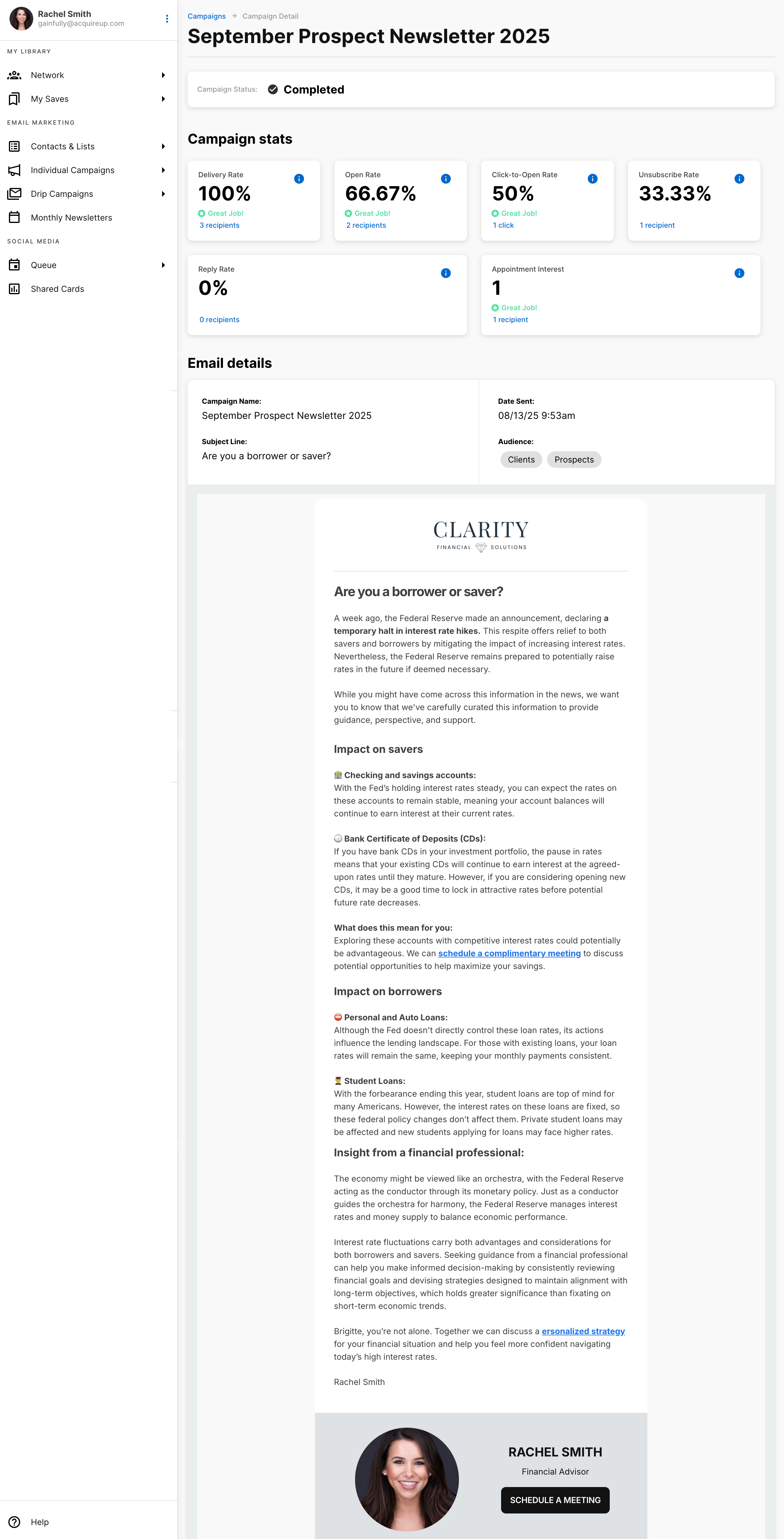 - Performance metrics: Delivery Rate, Open Rate, Click-to-Open Rate (CTOR), Unsubscribe Rate, Reply Rate, and Appointment Interest. Each metric shows both a percentage and the total number of recipients.