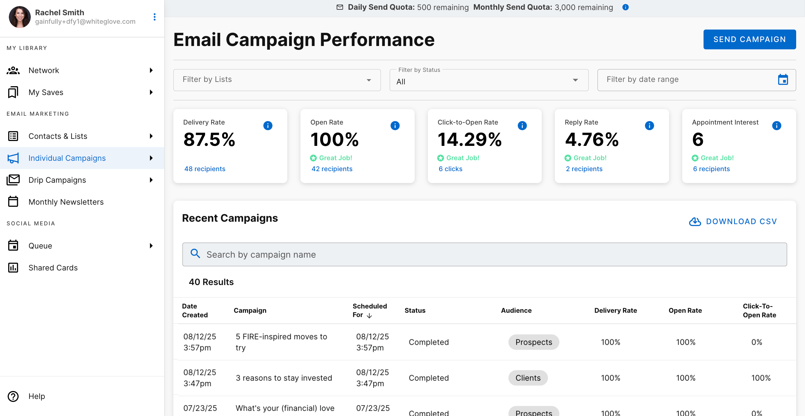 The main page provides a snapshot of how your email campaigns are performing. From here, you can: