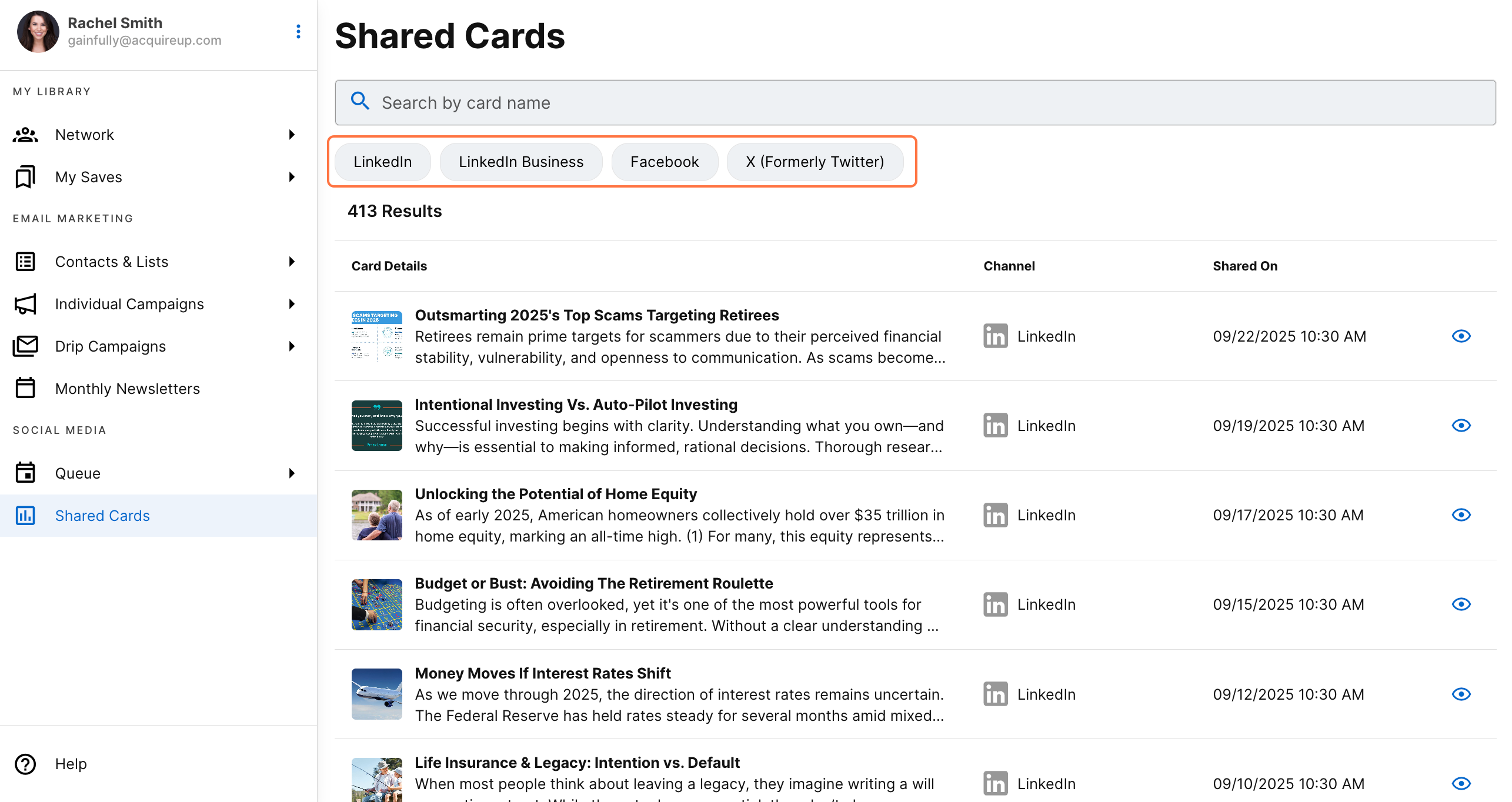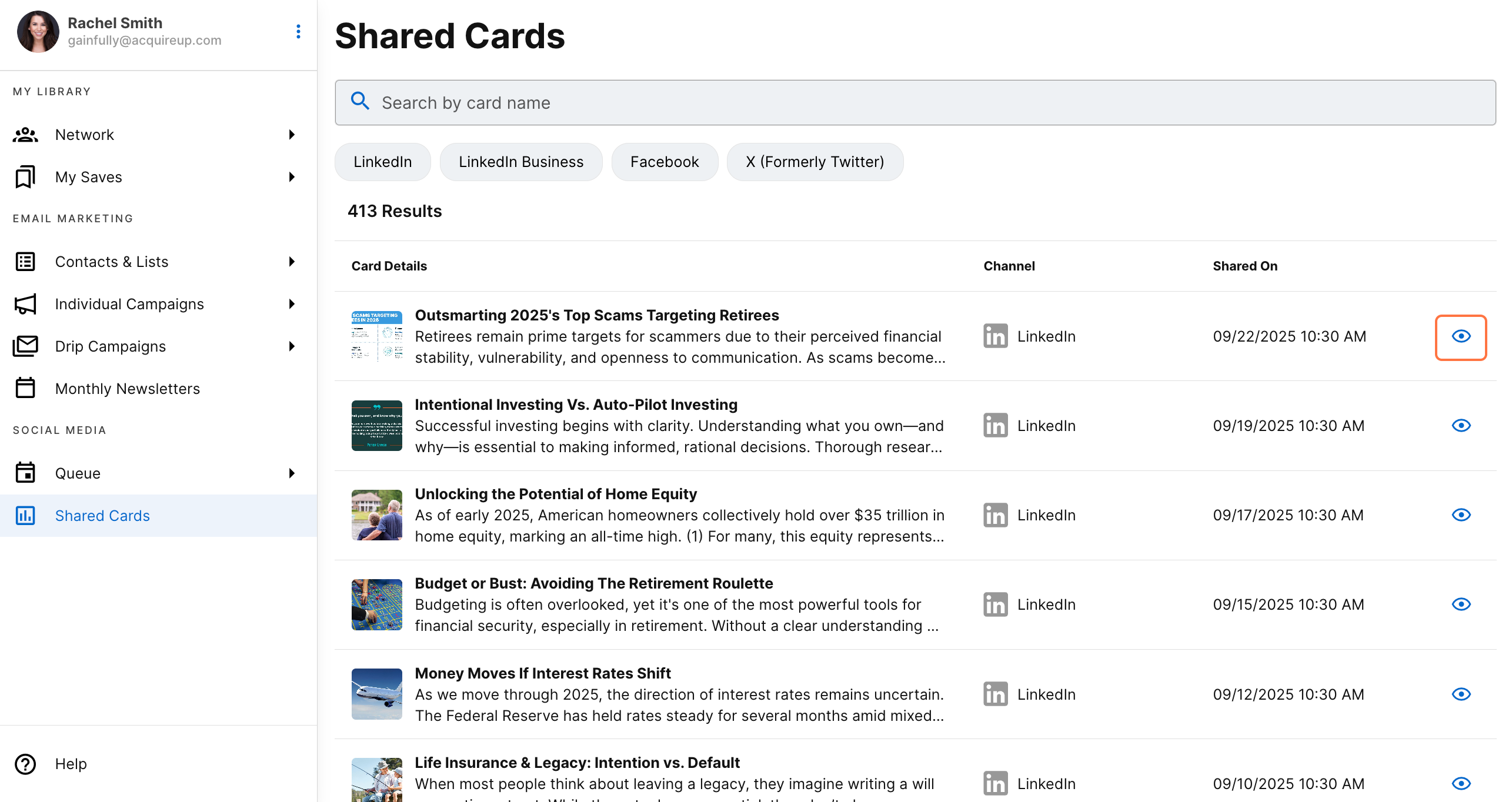 The Shared Cards page lets you review and manage all the cards you’ve previously shared. From here, you can search, filter, and preview your shared content to better understand what you’ve posted and where it went.