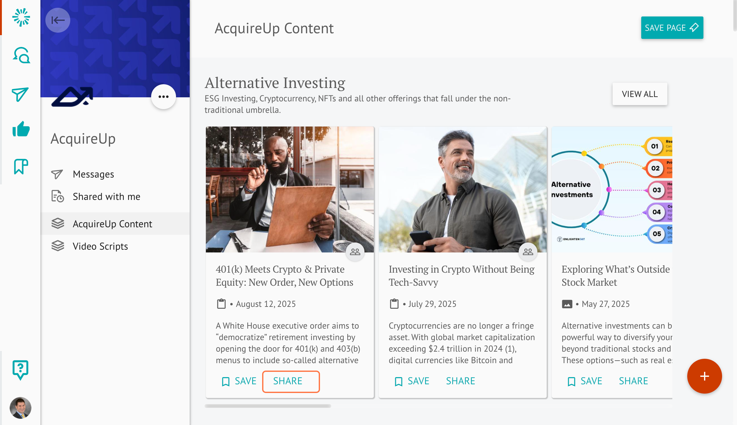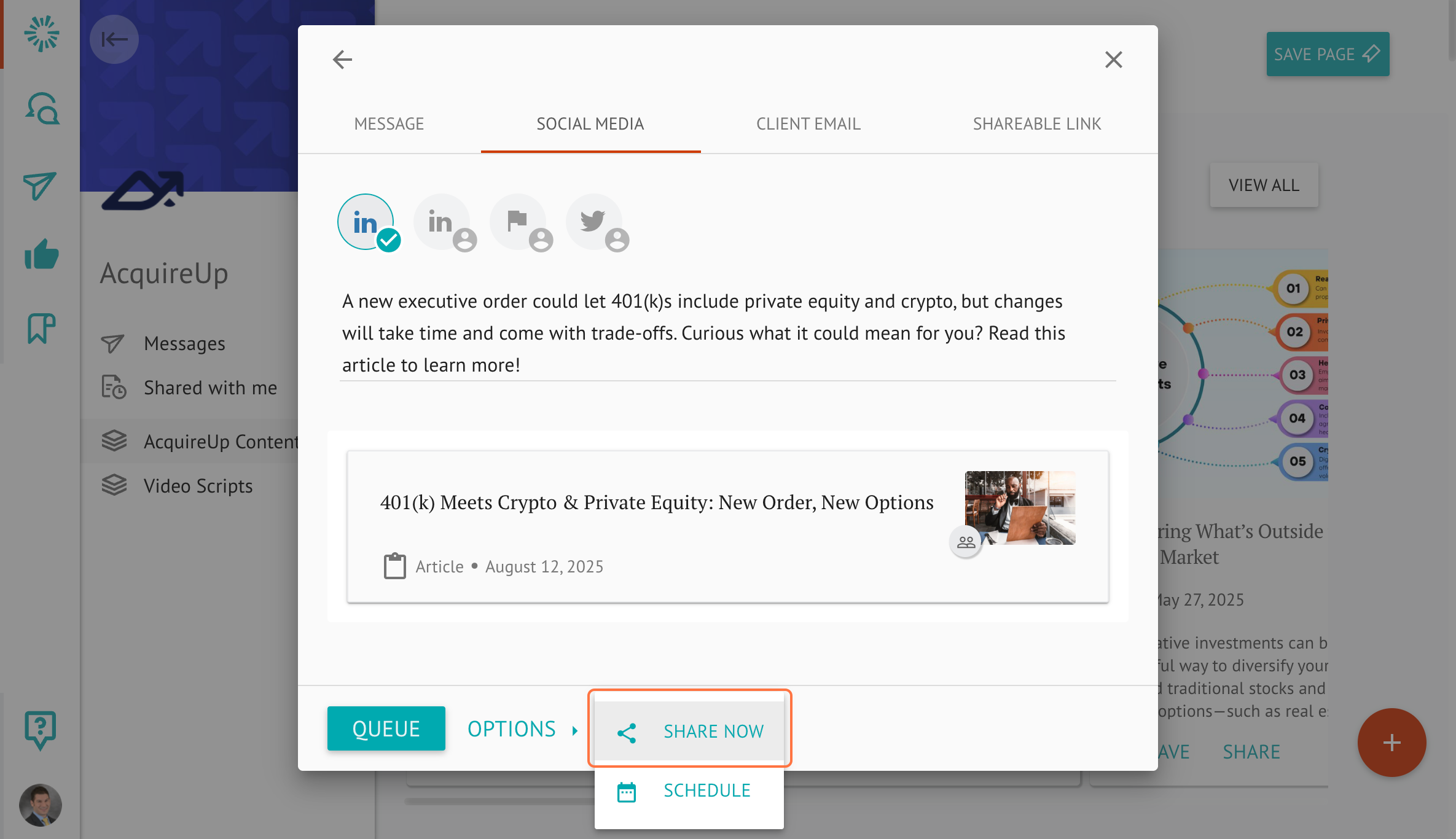 When you find a piece of content in Gainfully, you can choose to "Share Now" or "Schedule" it for a later date.