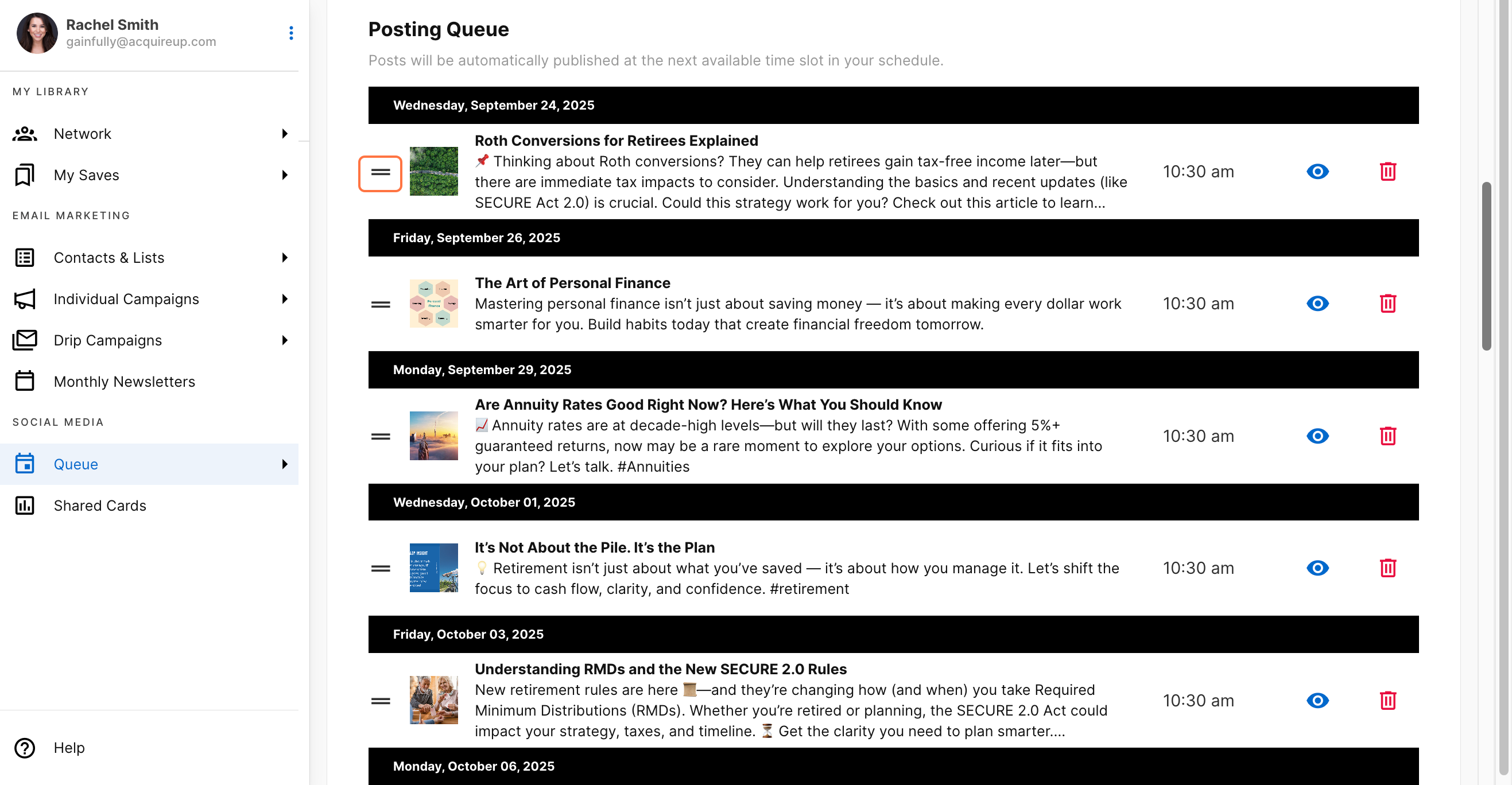 Queue Organization Your queued posts are organized by day, with each day shown under a black banner displaying the day of the week and date. This makes it easy to see what content is planned for each day.